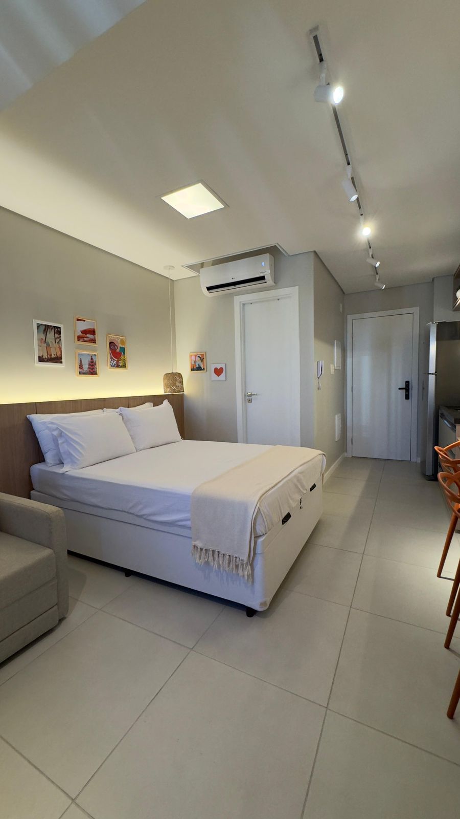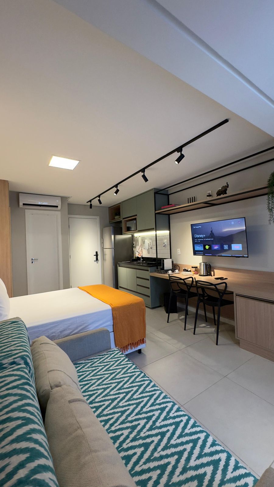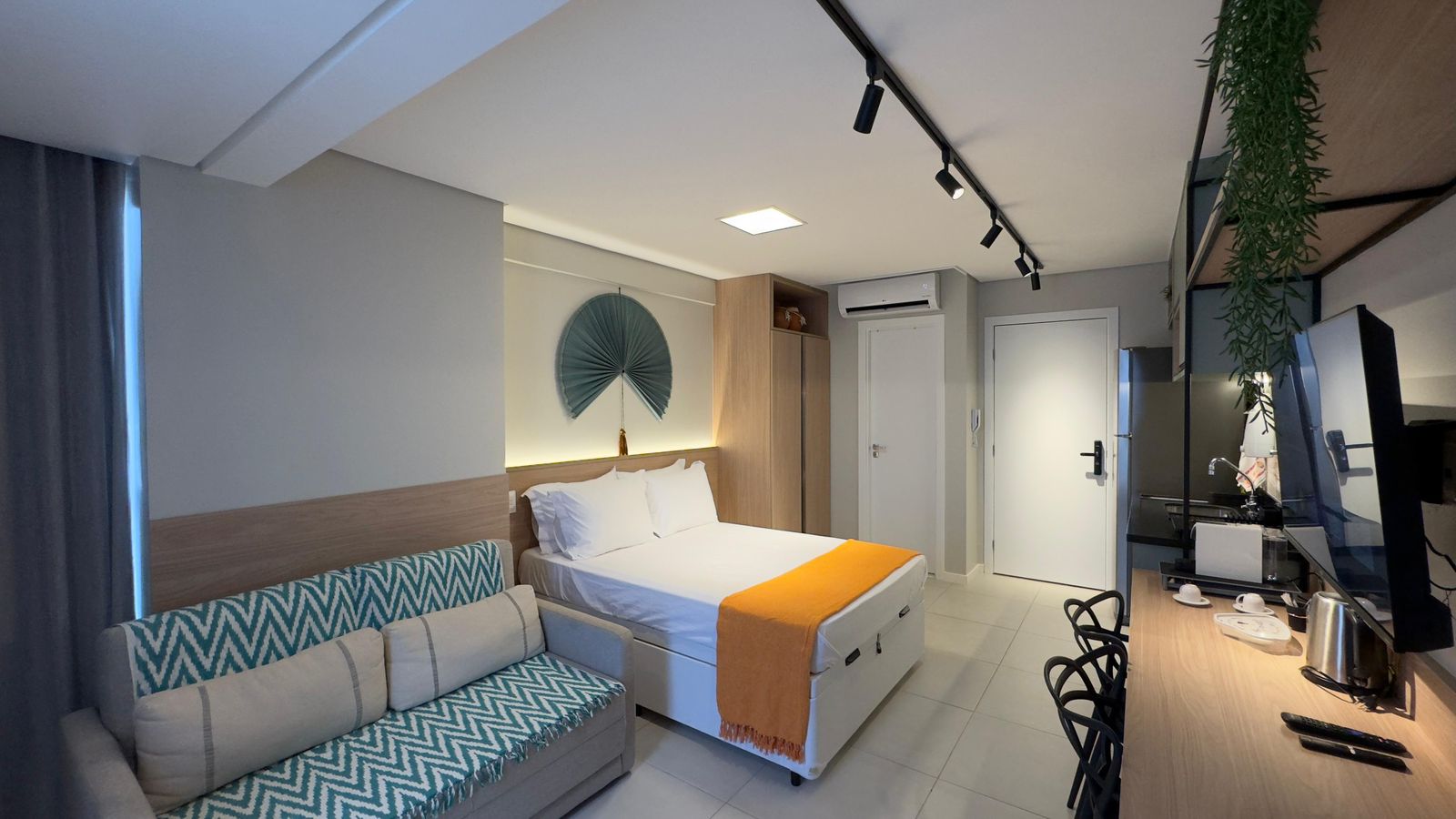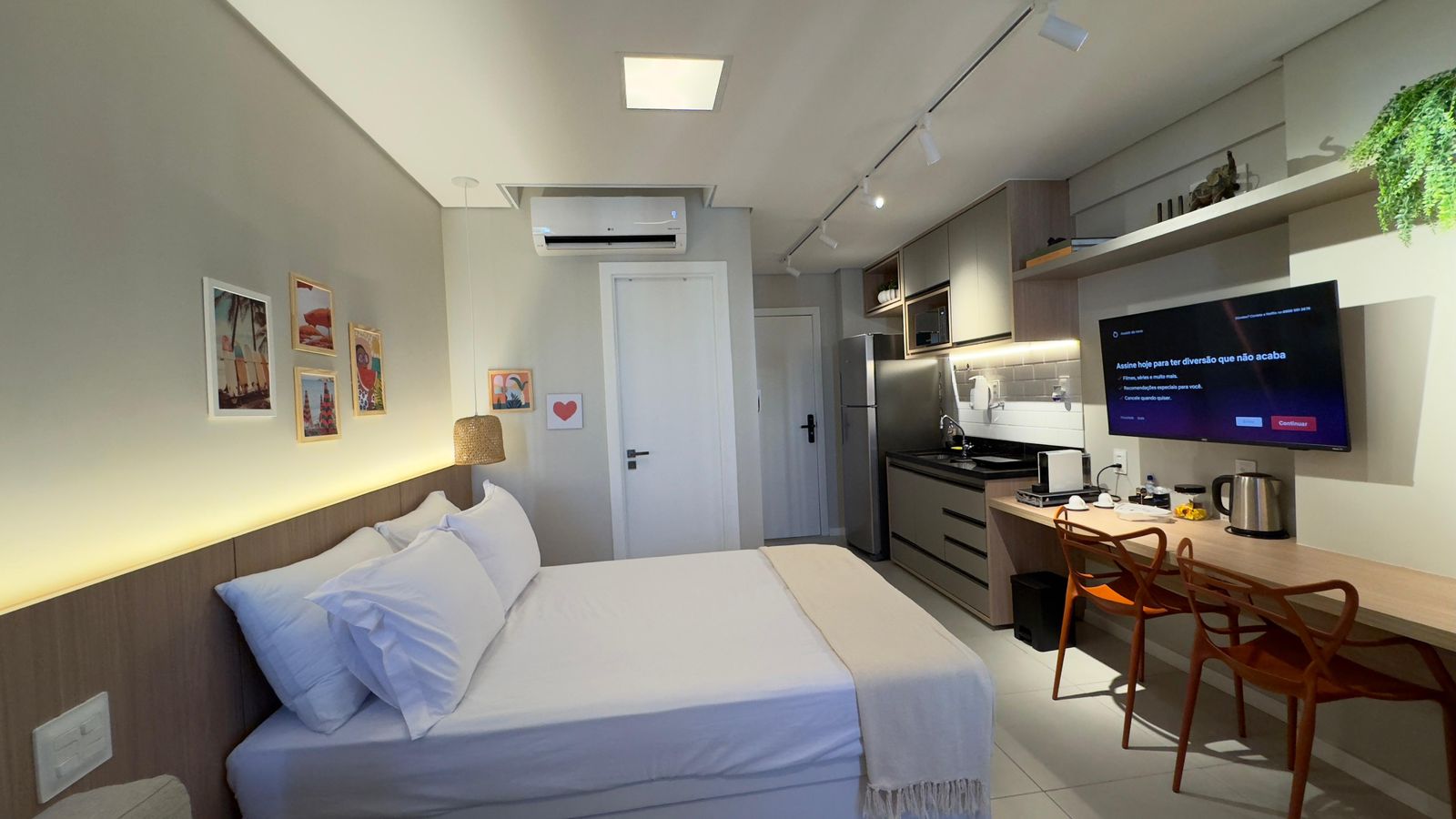 Apartamentos tipo studio, conjugado, novíssimo, climatizado, o qual possui uma decoração impecável, pensada nos mínimos detalhes, para lhe proporcionar conforto e funcionalidade. Cozinha equipada com todos os utensílios para você preparar e fazer as suas refeições, uma cama de casal, com mesa lateral, e um sofá-cama que tem capacidade para duas pessoas.