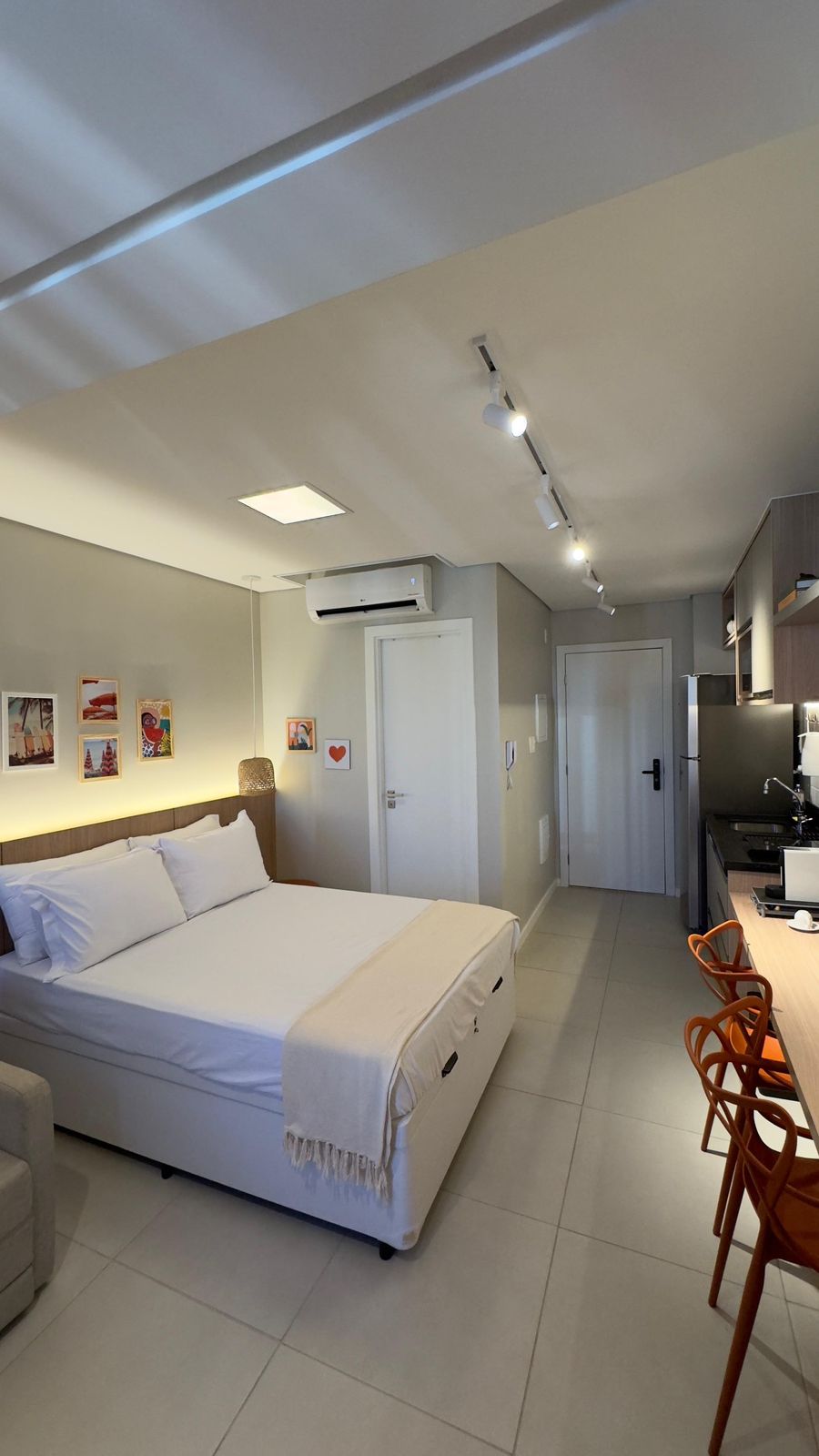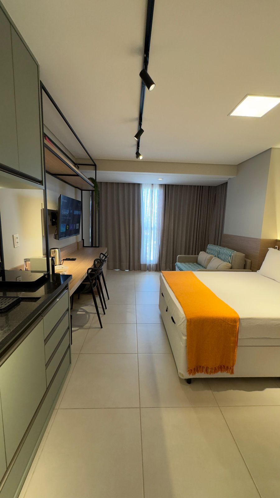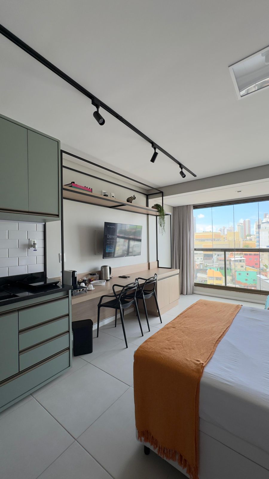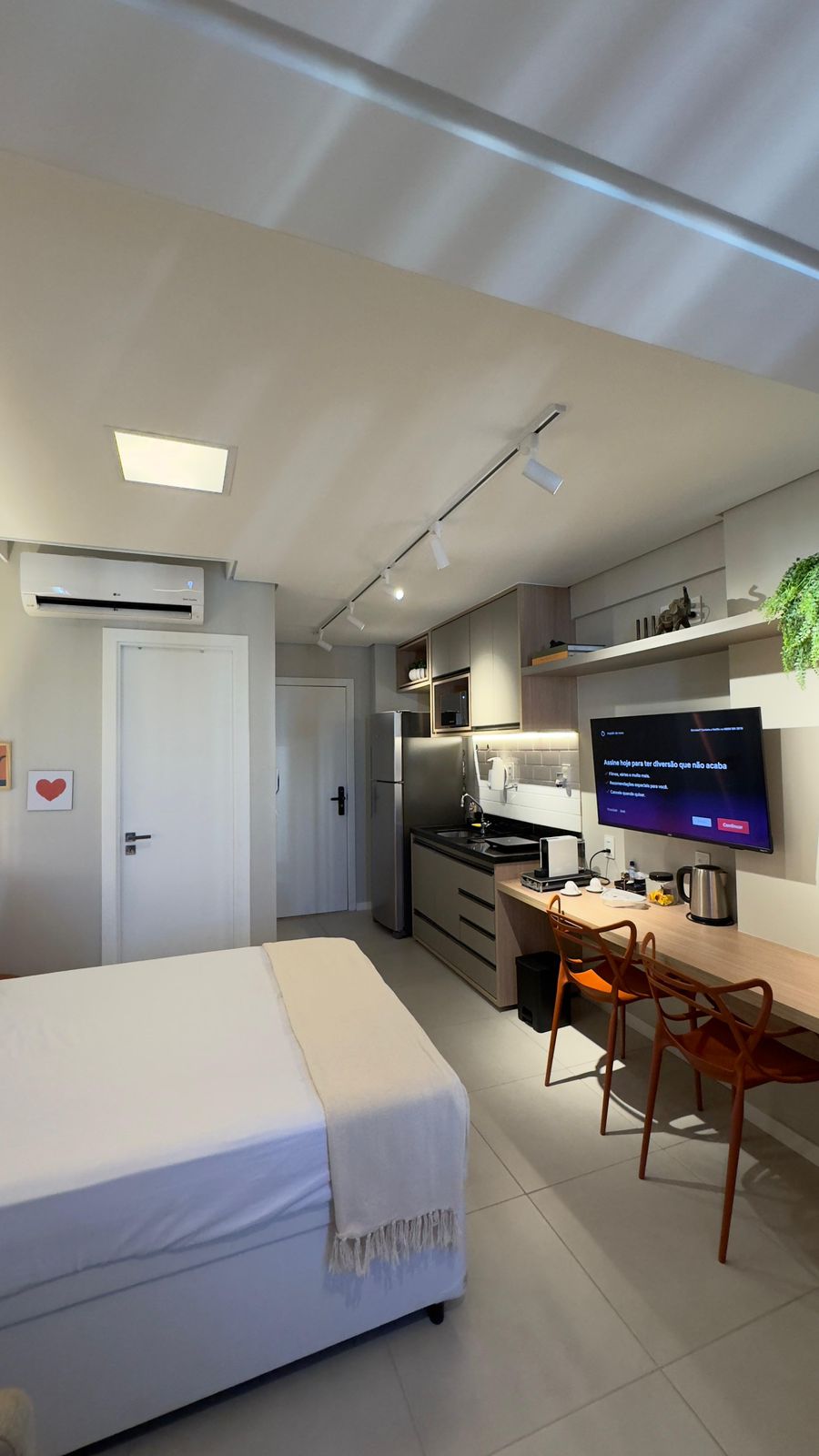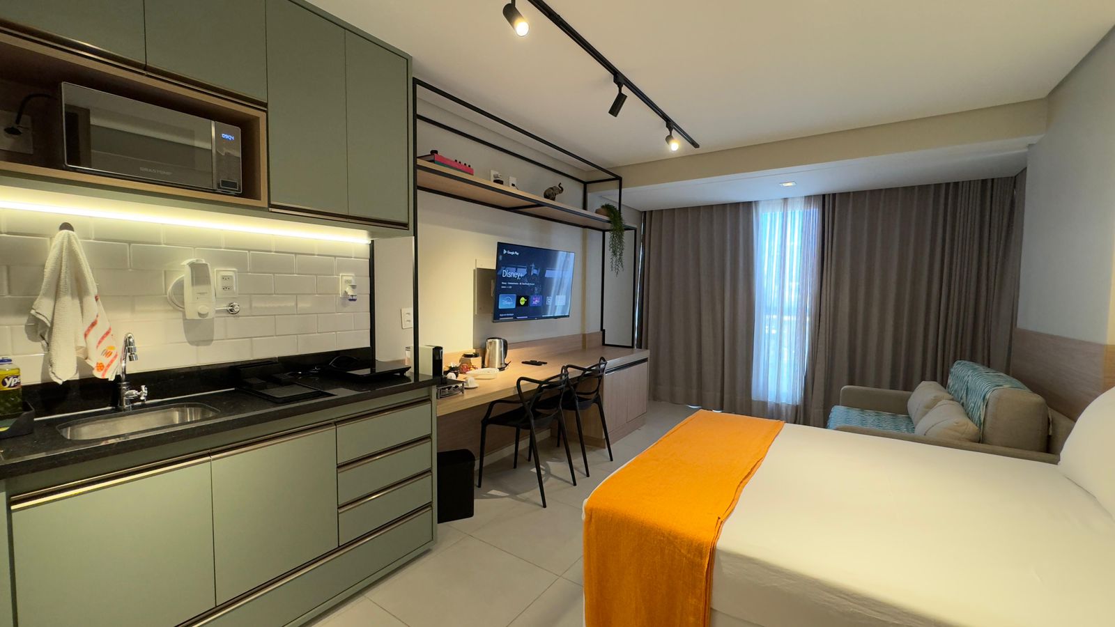 Apartamentos tipo studio, conjugado, novíssimo, climatizado, o qual possui uma decoração impecável, pensada nos mínimos detalhes, para lhe proporcionar conforto e funcionalidade. Cozinha equipada com todos os utensílios para você preparar e fazer as suas refeições, uma cama de casal, com mesa lateral, e um sofá-cama que tem capacidade para duas pessoas.
