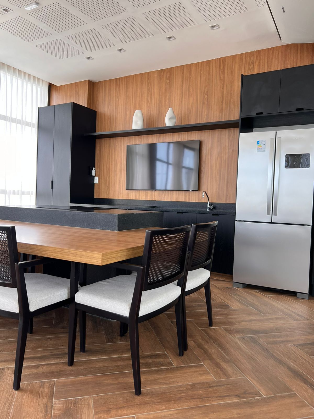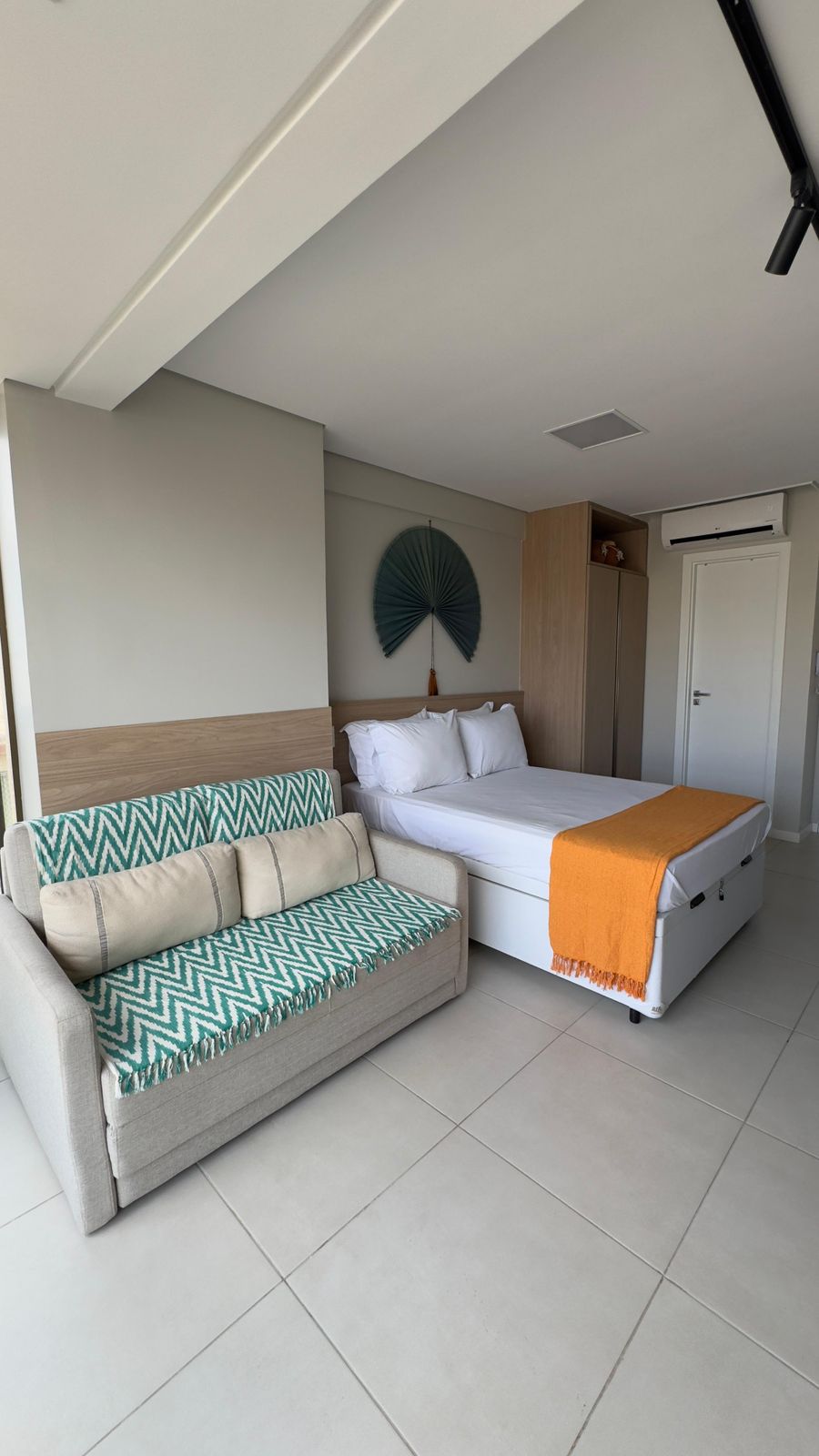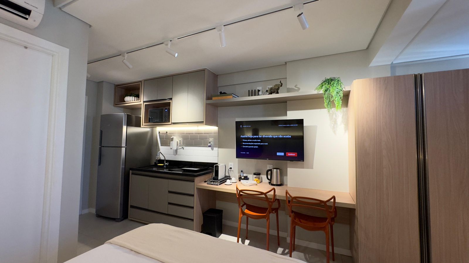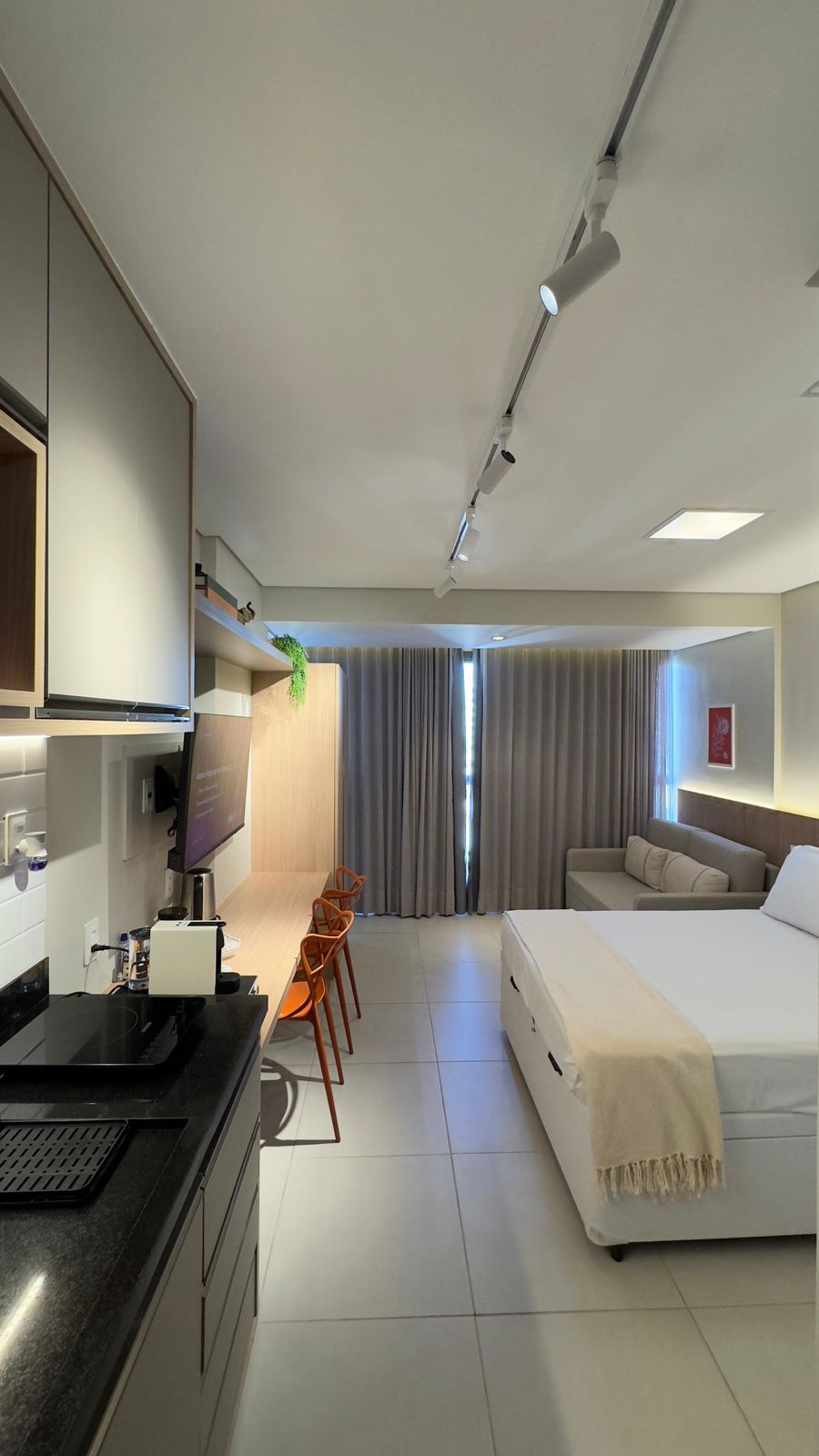 Apartamentos tipo studio, conjugado, novíssimo, climatizado, o qual possui uma decoração impecável, pensada nos mínimos detalhes, para lhe proporcionar conforto e funcionalidade. Cozinha equipada com todos os utensílios para você preparar e fazer as suas refeições, uma cama de casal, com mesa lateral, e um sofá-cama que tem capacidade para duas pessoas.